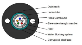 1. Strength Member : two phosphated steel wires. 2. Loose Tube: thermoplastic material, containing optical fibres and filled with gel. 3. Longitudinal Water Blocking Matertal: water blocking tape. 4. Armor: corrugated steel tape. 5. Outer Sheath: black polyethylene.